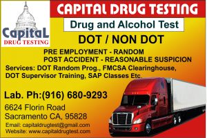 CAPITAL DRUG TESTING DRUG/ALCOHOL TEST DOT/ NON-DOT Pre-employment -Random -Post Accident -Reasonable Suspicion. We help with Clearing House, Supervisor Training etc. Call: (916) 680-9293 6624 Florin Road, Sacramento, CA, 95828